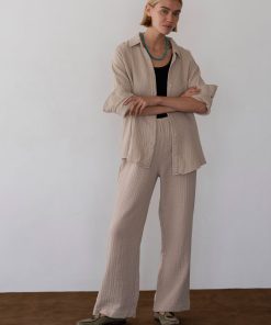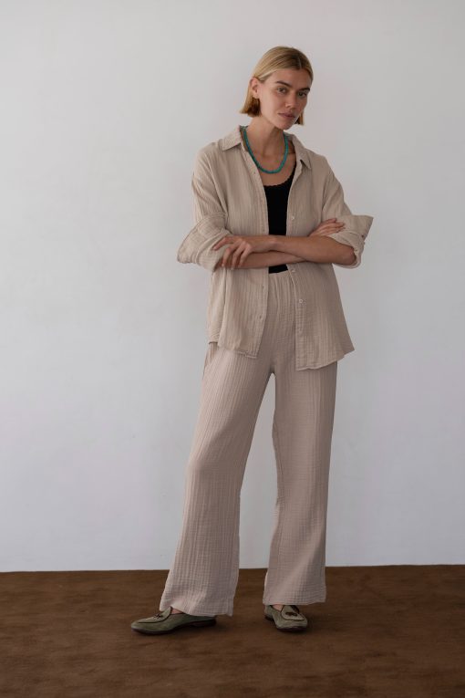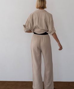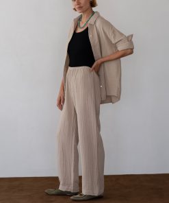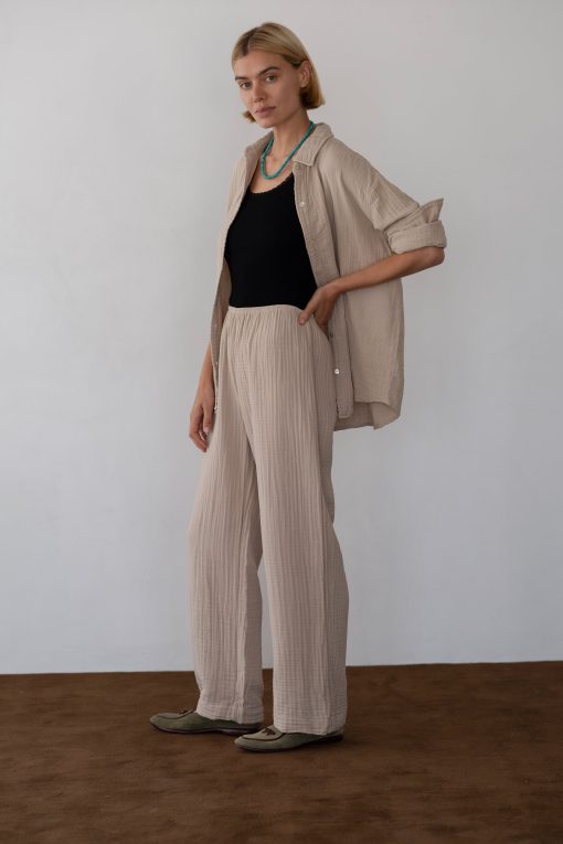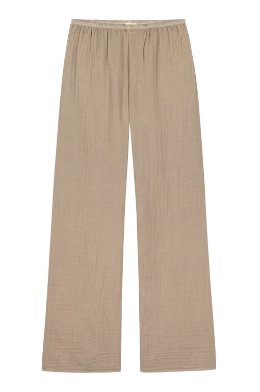 The Bubble Crop Simple Pant is crafted from ultra-soft, lightweight 100% cotton gauze and features an easy elastic waistband, cropped fit, and a gauzy texture.