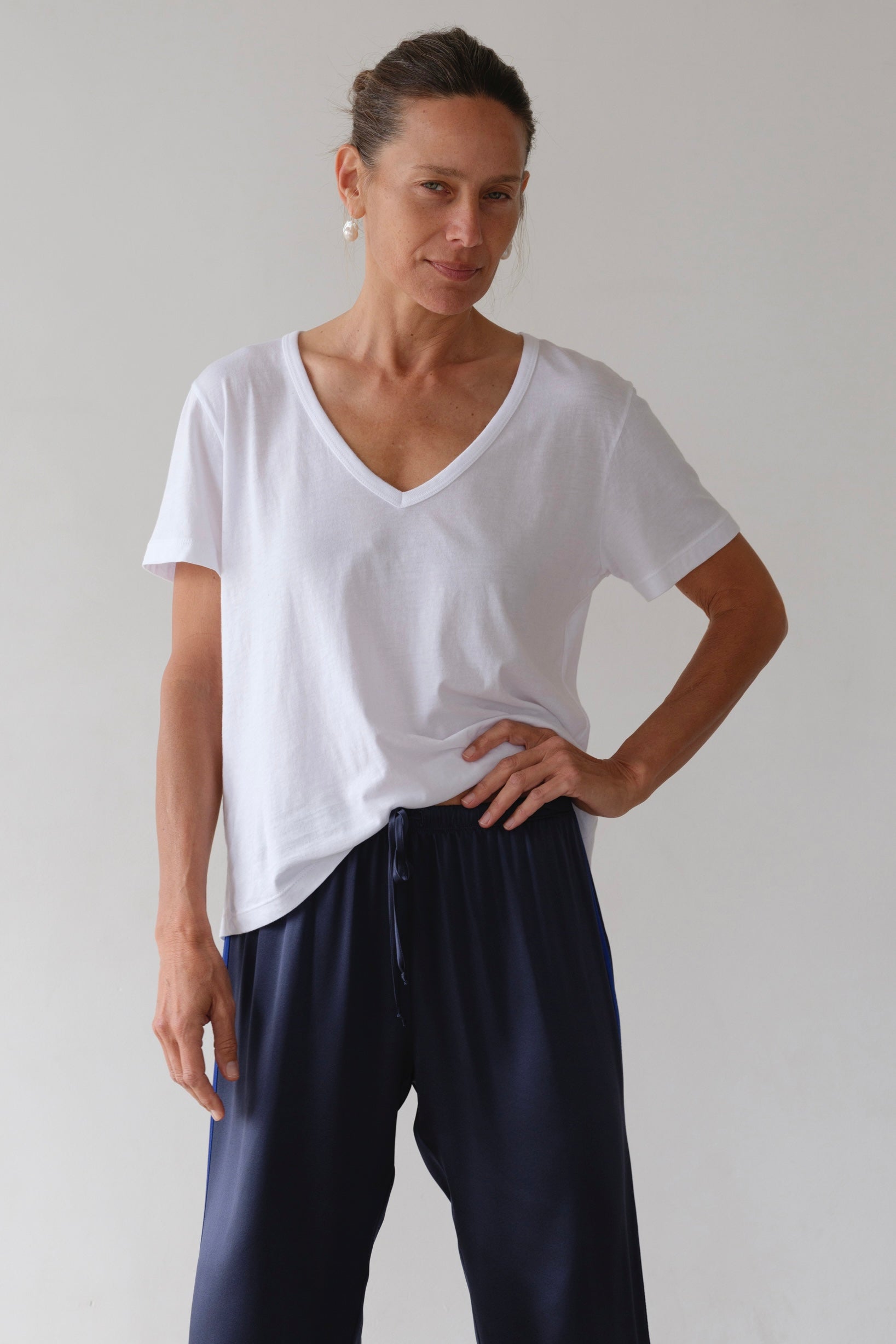 The Jersey Relaxed V-Neck is crafted from 100% cotton and features a softly structured V neckline and an easy, wearable fit.