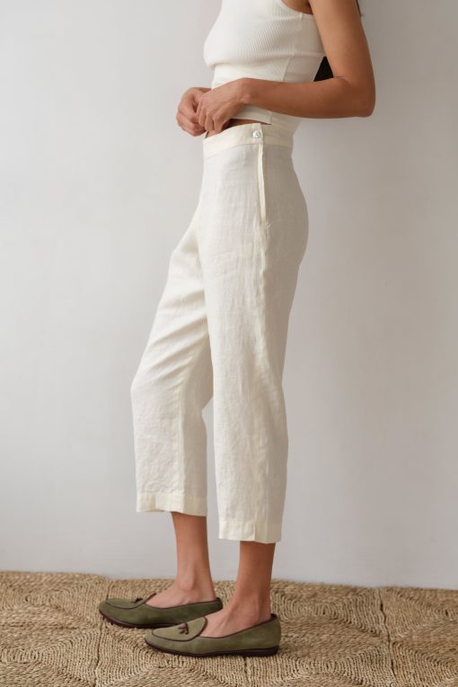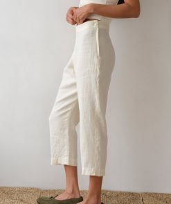 The Linen Capri Pant is crafted from our signature lightweight linen. Featuring a cropped fit, a left-side zip closure with a mother of pearl button, and subtle slits at the hem for an effortlessly refined finish.