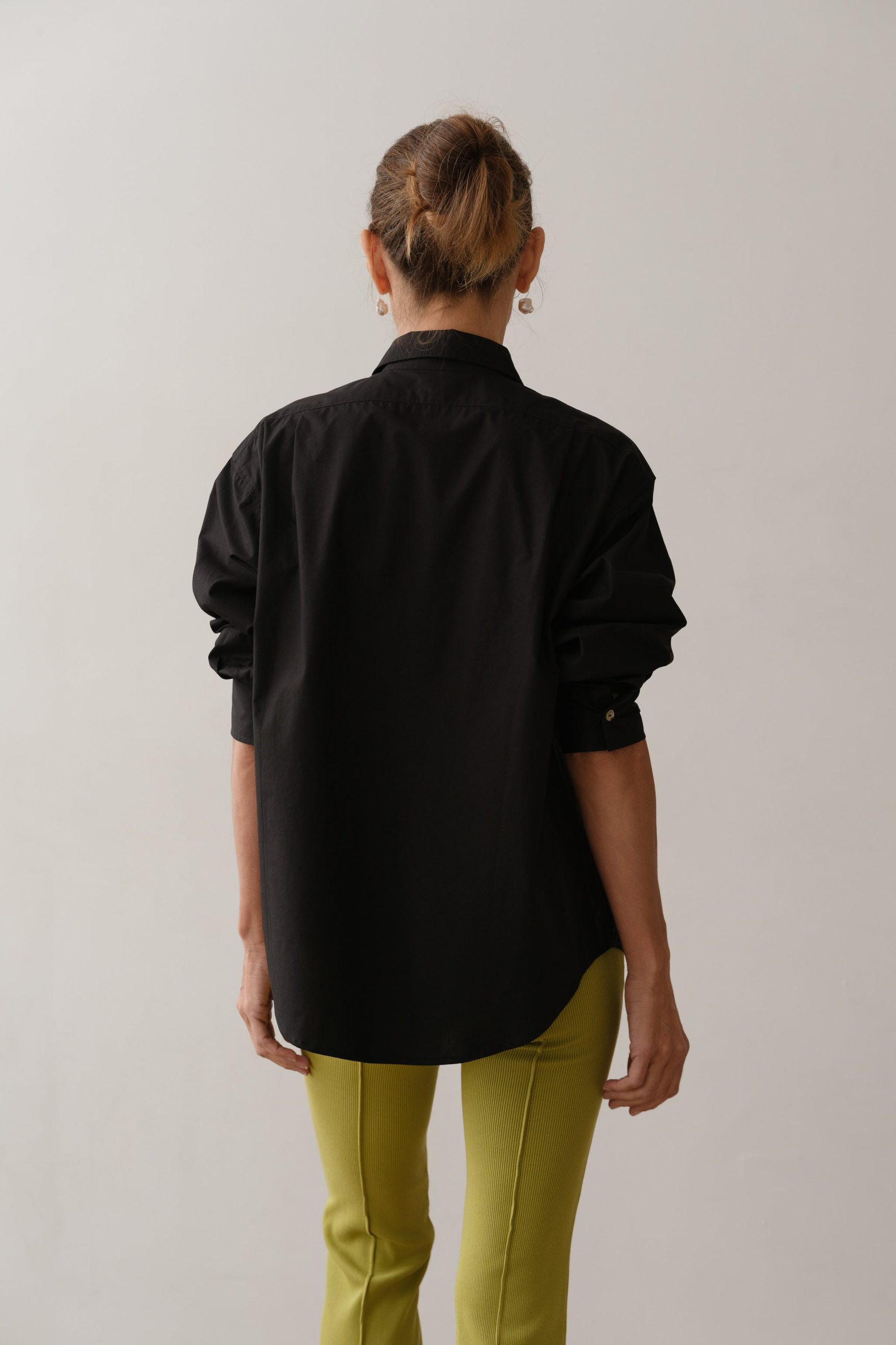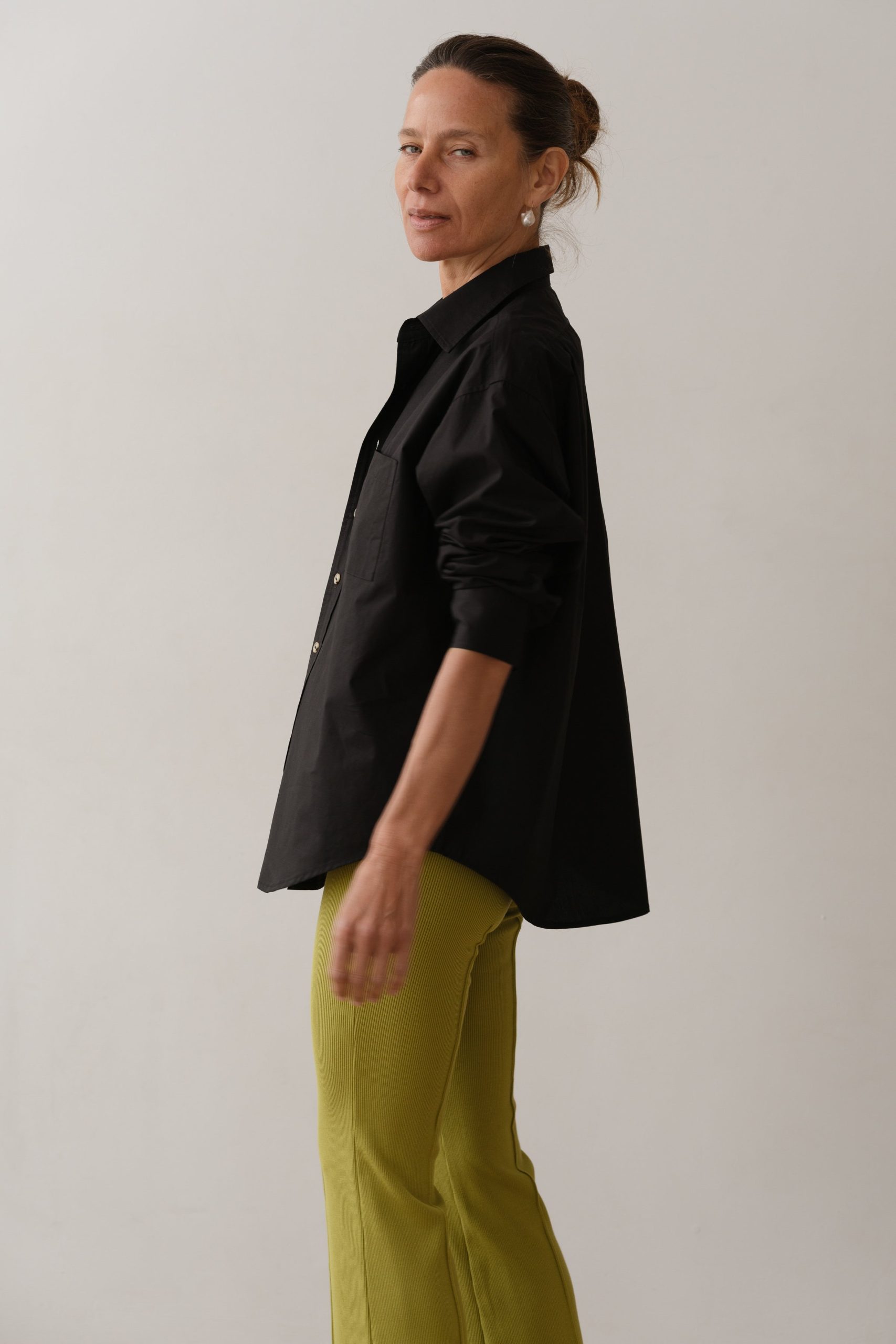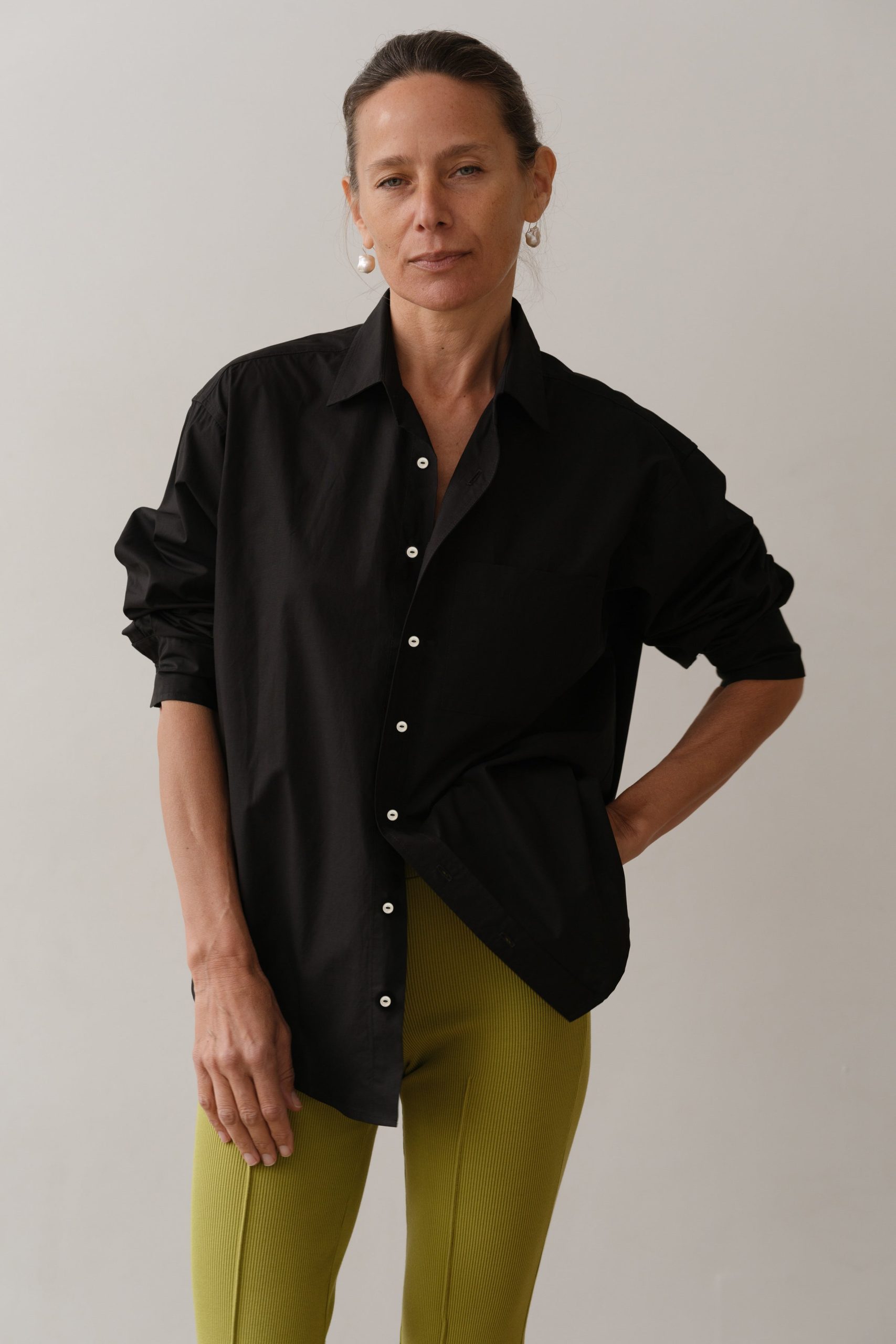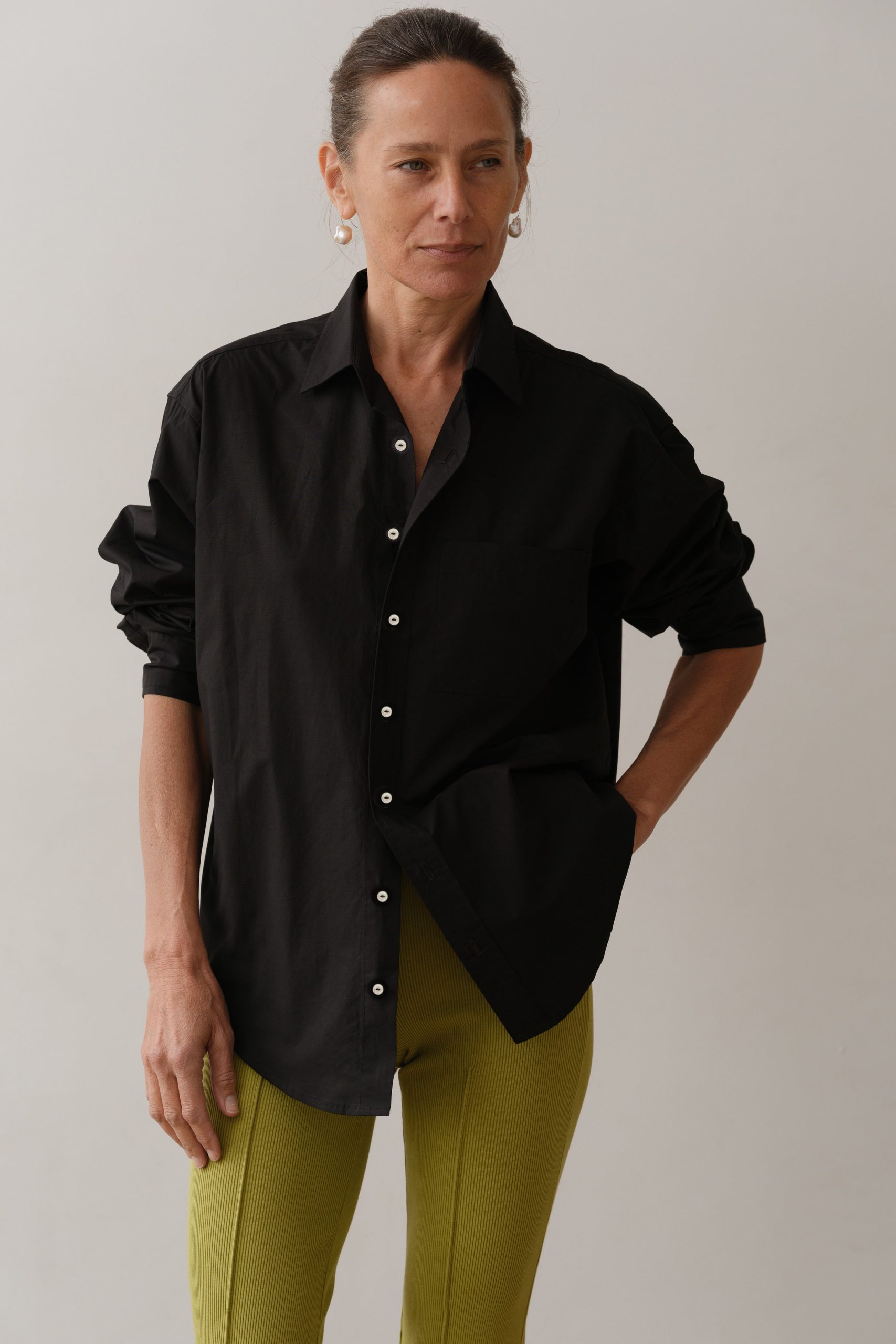 Our iconic Pop Button Down. A seasonless essential crafted with 100% cotton poplin, featuring a subtle dropped shoulder and tortoise-like buttons. Set it up with — The Pop Pant or The Silky Simple Pant Made in LA