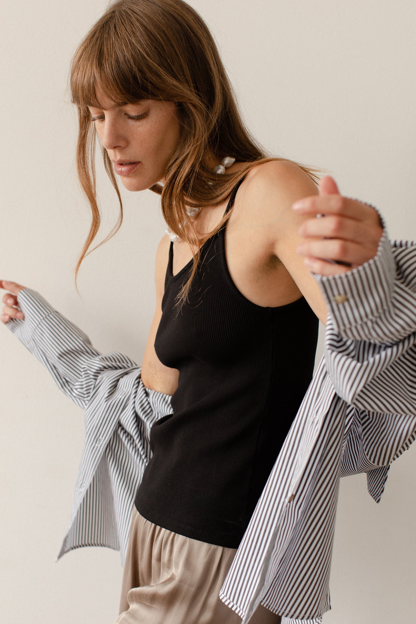 A year-round essential, effortlessly versatile for layering or wearing solo. Designed with a scoop neck, spaghetti straps, and a fine rib texture that provides the perfect amount of hold—no bra required.