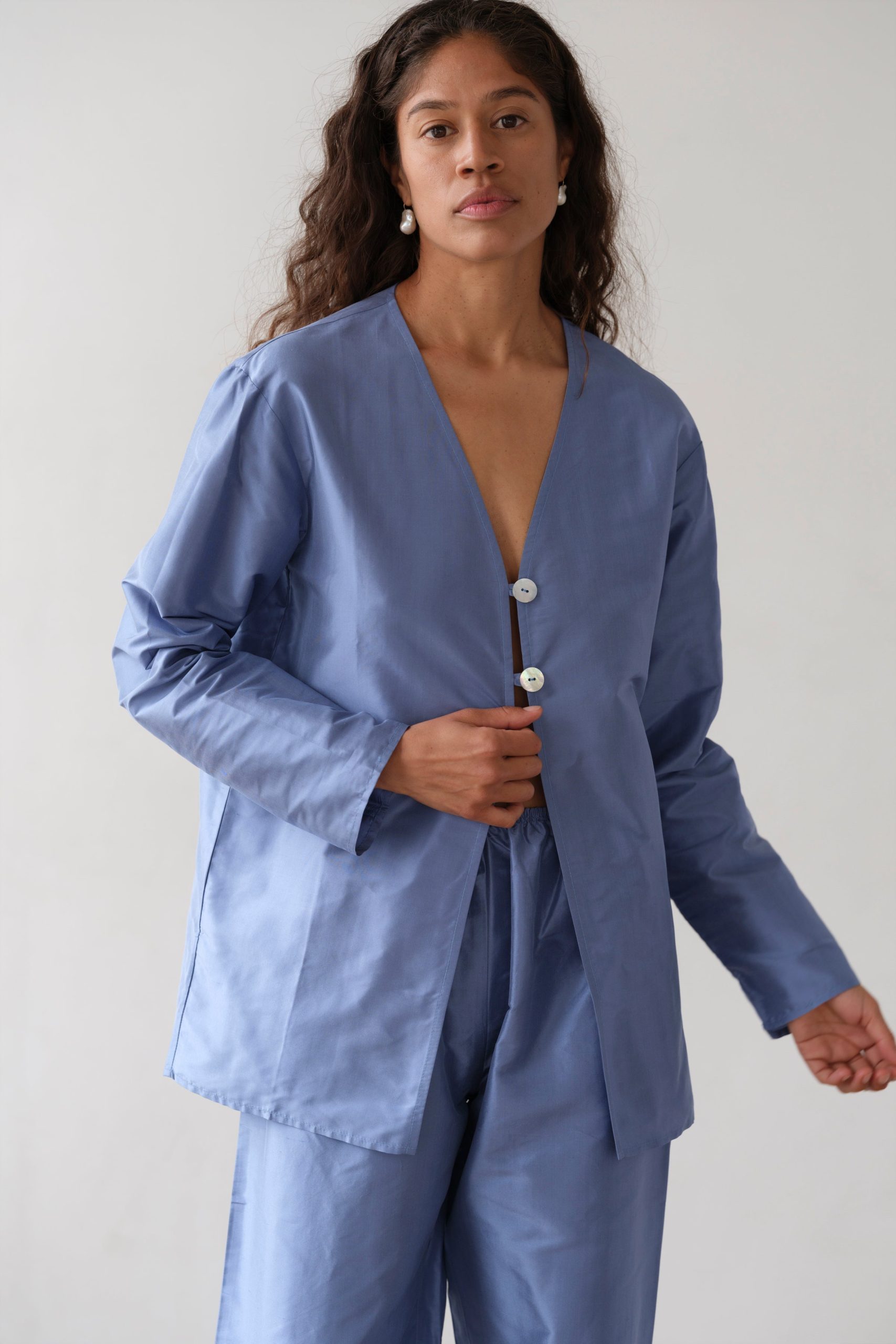The Taffeta Split Top is crisp and lightweight. Crafted from our 100% silk taffeta fabric, featuring a relaxed fit, v-neck, and mother of pearl button.
