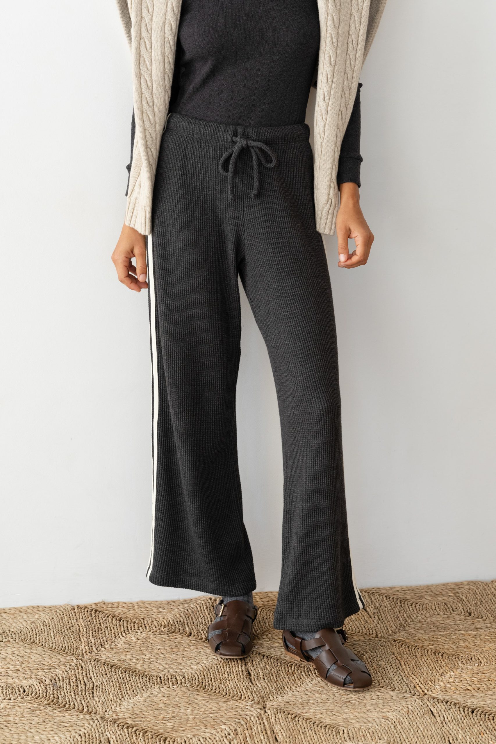 The Thermal Crop Stripe Pant is crafted from soft, breathable thermal. It features a cropped fit, double stripe detail, waffle texture, and an adjustable drawstring waistband for effortless style and comfort.