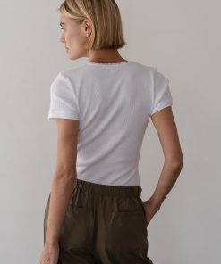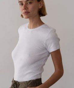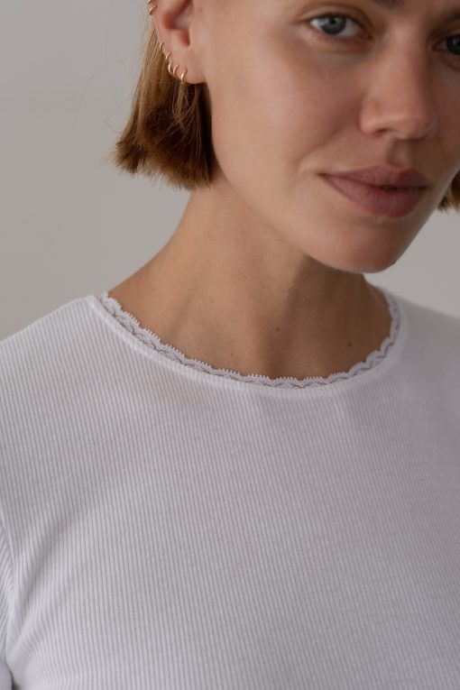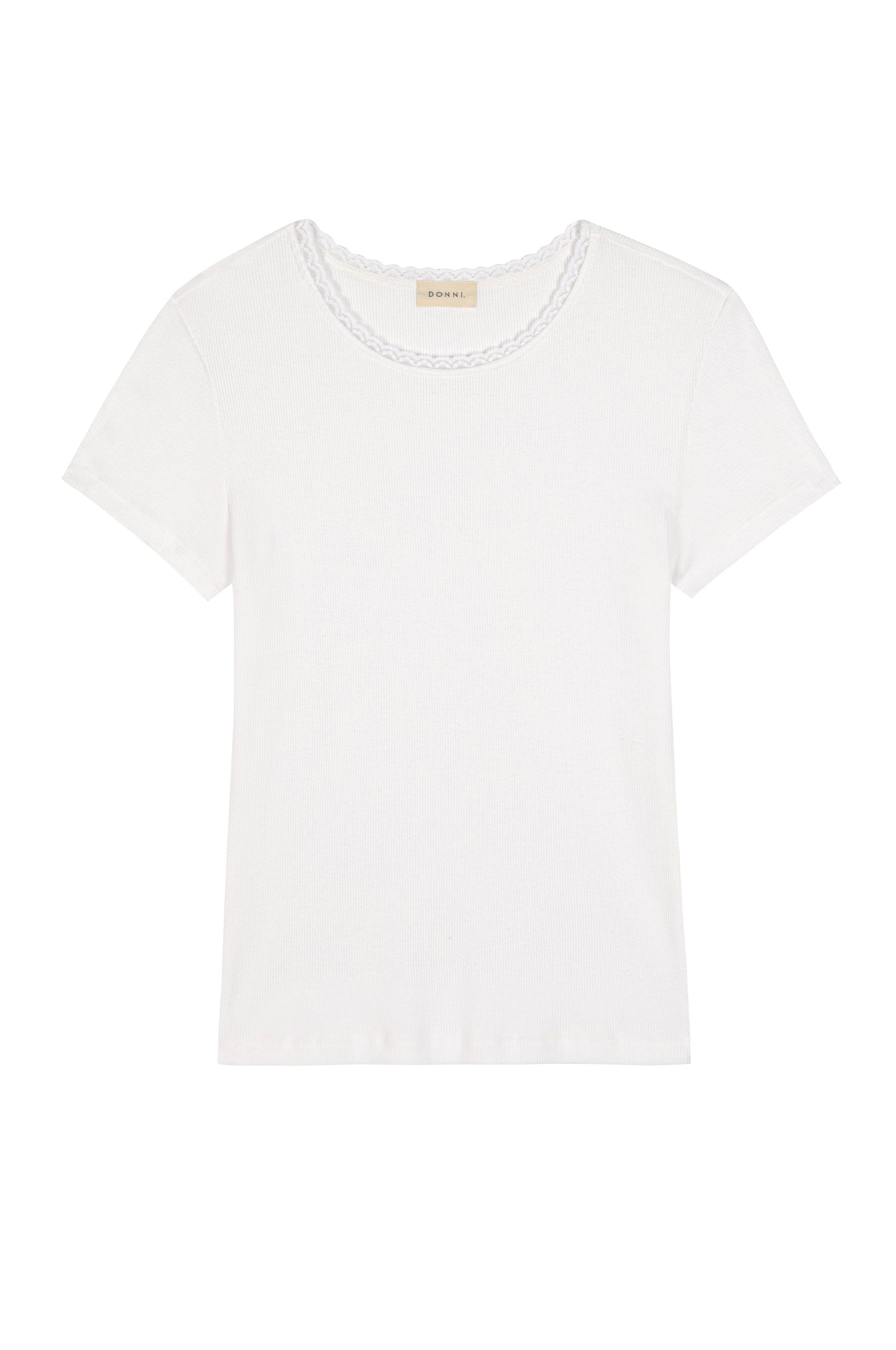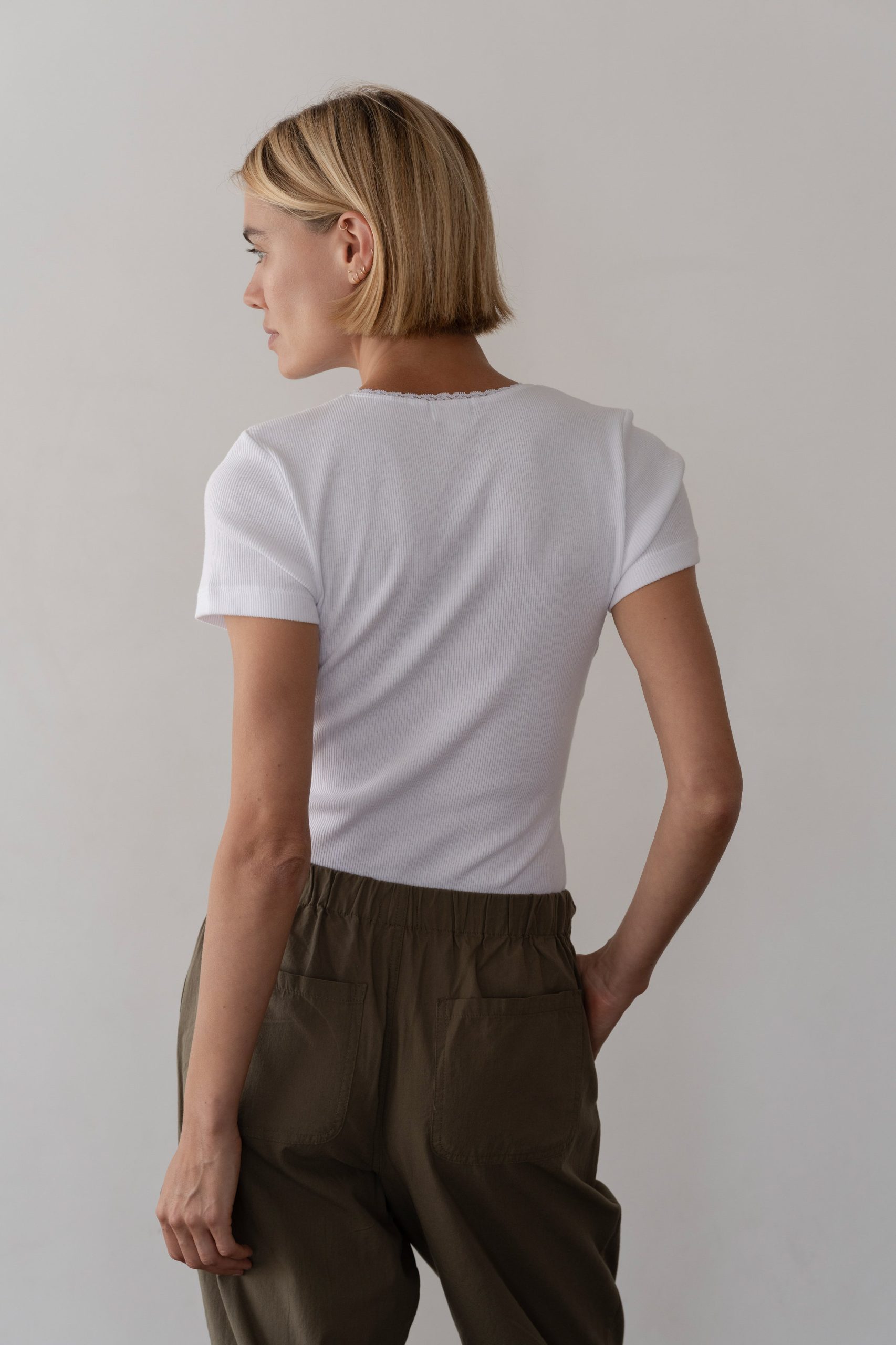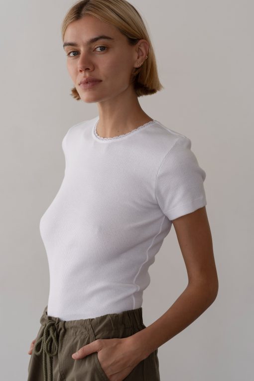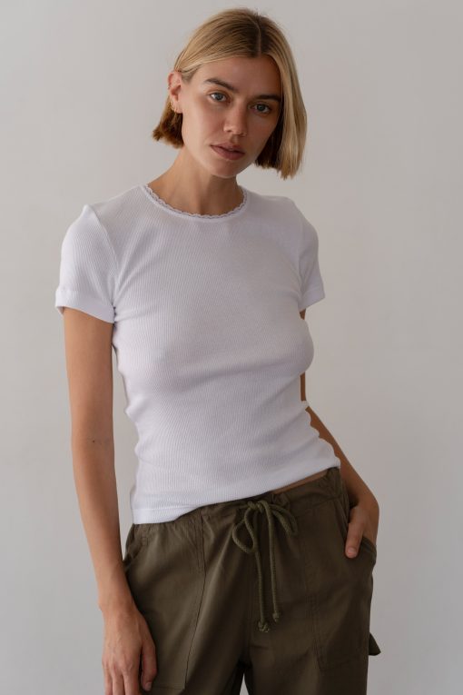 The Vintage Rib Lace Tee is crafted from 100% cotton and features ultrasoft micro ribbing, lace-trimmed edges, and a true-to-size fit for easy everyday wear.